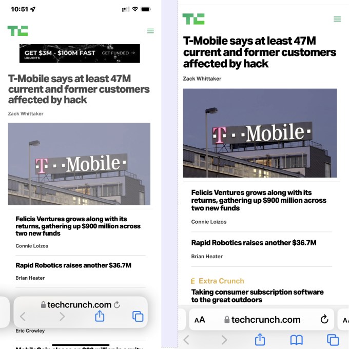 One significant complaint with the floating tab bar was that it made some websites nearly unusable, as the bar would block out elements you needed to click. (To get to these unreachable parts of the page, you’d have to swipe the bar down — a less-than-ideal experience).