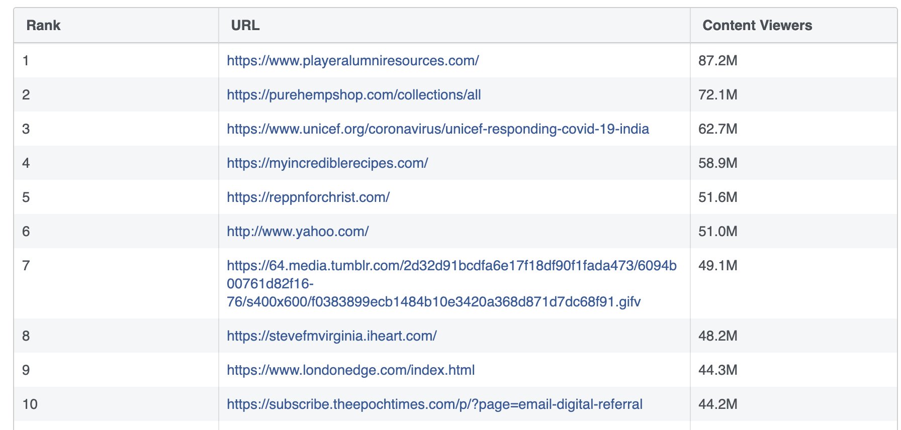 YouTube is predictably the top domain by Facebook’s chosen metric of “content viewers,” which it defines as any account that saw a piece of content on the News Feed, though we don’t get anything in the way of potentially helpful granular data there. Amazon, Gofundme, TikTok and others also in the top 10, no surprises there either.