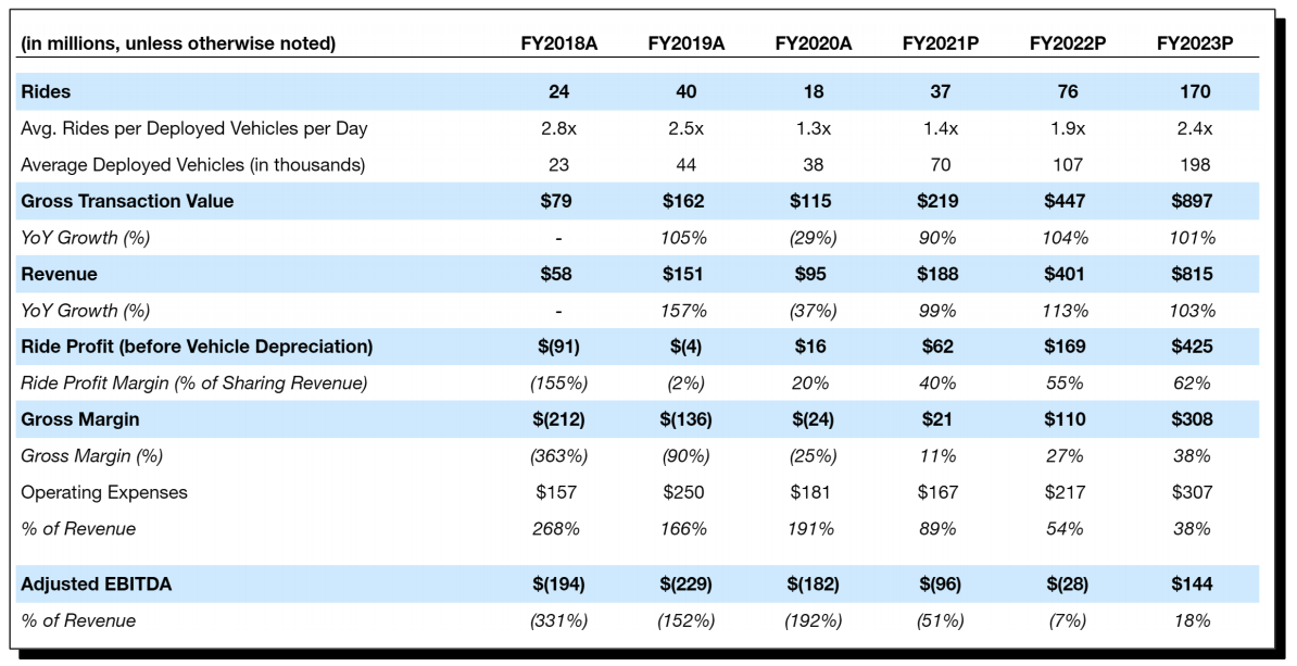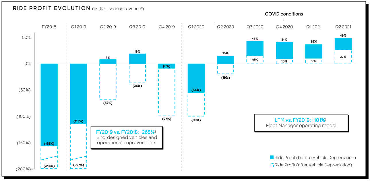 - Continued improvement to its ride profit margins, including a more than 50% improvement from its 2021 expectations (40% ride profit margin, measured as a percentage of “sharing revenue”) to its 2023 forecast (62% ride profit margin, measured as a percentage of “sharing revenue”). In turn, Bird expects improved ride-focused profit to generate better gross margins.