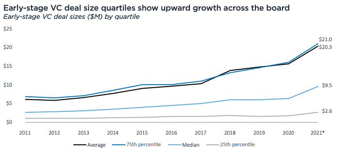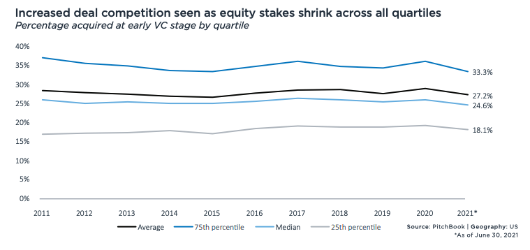 To summarize what PitchBook published: Round sizes are going up as valuations go up, and with the latter rising faster than the former, we’re not seeing investors get more ownership despite them having to spend more for deal access.