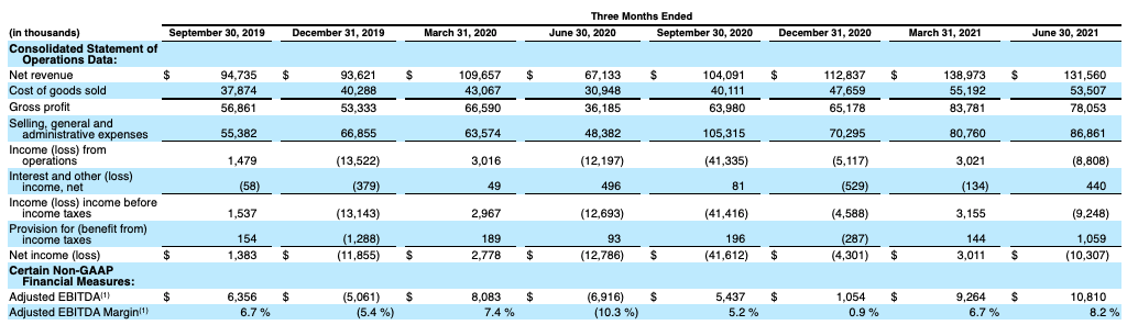 Don’t worry about the wall of numbers. Just track the top line (revenue) against time. As we can quickly see, Warby had a pretty weak Q2 2020, the period ending June 30 of last year. The company did manage to reduce SG&A costs during that quarter, which saved it from posting even deeper losses. But having such a lackluster quarter meant that 2020 was essentially a lost year at the company in aggregate growth terms.