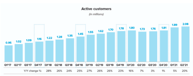 Another way to view the company’s COVID hit is to track its “active customers” metric. This is the number of customers who have “made at least one purchase in the preceding 12-month period.” Here’s that chart: