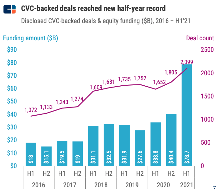 Fair enough. Per CB Insights’ H1 2021 CVC report, CVCs participated in $78.7 billion in funding activity in the first half of 2021, a record for a half-year period. That dollar figure was derived from some 2,099 deals around the world. Precisely how strong those figures are is not clear from their absolute scale.