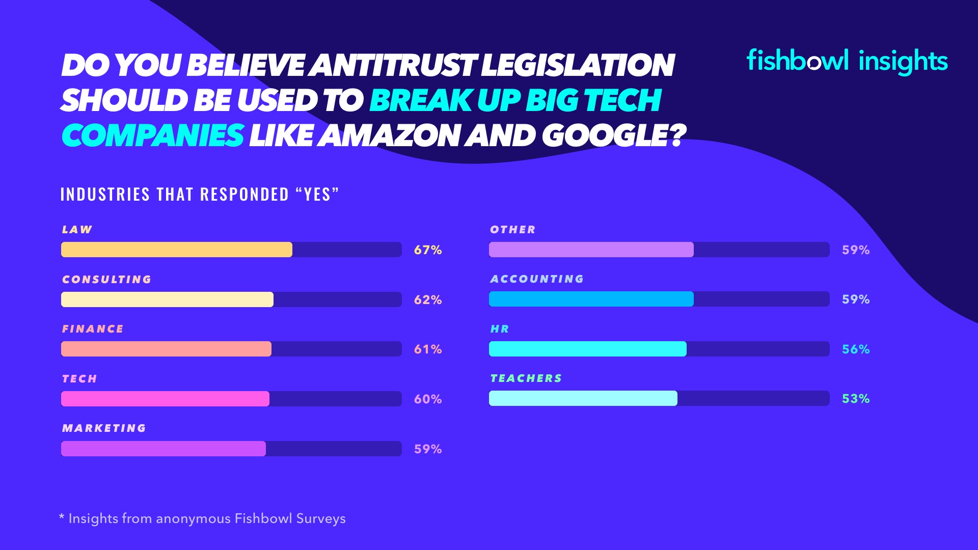 This topic has raised interest among professionals, more specifically those who work in the tech industry, startups and small businesses. We at Fishbowl thought we’d ask professionals — many of whom work in the tech industry — about breaking up tech giants. Fishbowl is a social network for professionals, so conducting surveys on this and other workplace topics is a natural fit.