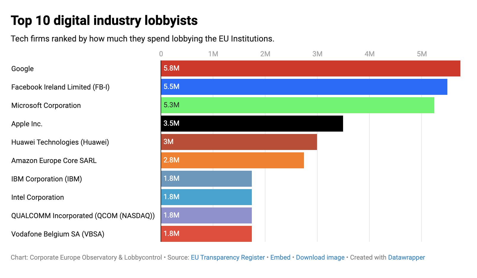 Google topped the lobbying list of Big Tech big spenders in the EU — spending €5.8 million annually trying to influence EU institutions, per the report, followed by Facebook (€5.5 million), Microsoft (€5.3 million), Apple (€3.5 million) and Huawei (€3 million).