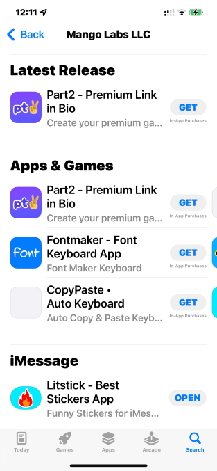 As it turns out, Fontmaker is not your typical “indie app.” In fact, it’s unclear who’s really behind it. Its publisher, Mango Labs, LLC, is actually an iTunes developer account owned by the mobile growth company JetFuel, which was recently acquired by the mobile ad and monetization firm Vungle — a longtime and sometimes controversial player in this space, itself acquired by Blackstone in 2019.