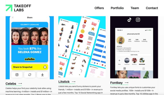 Takeoff Labs’ website also shows off its “portfolio” of apps, which includes Celeb, Litstick, and FontKey — three apps that are published by Mango Labs on the App Store.