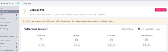 It had showcased its influencer marketing system using a case study from an “indie developer” called Mango Labs and one of its earlier apps, Caption Pro. Caption Pro launched in Jan. 2018. (App Annie data indicates it was removed from the App Store on Aug. 31, 2021…yes, yesterday).