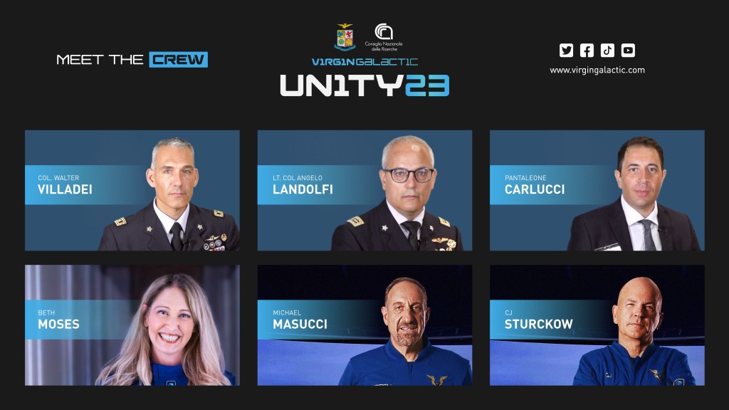 The role of mission lead will be held by Walter Villadei, a colonel with the Italian Air Force; Angelo Landolfi, a physician and lieutenant colonel; Pantaleone Carlucci, an aerospace engineer on behalf of the National Research Council; and Virgin Galactic’s chief astronaut instructor Beth Moses. Michael Masucci and CJ Sturckow will pilot the spaceplane.
