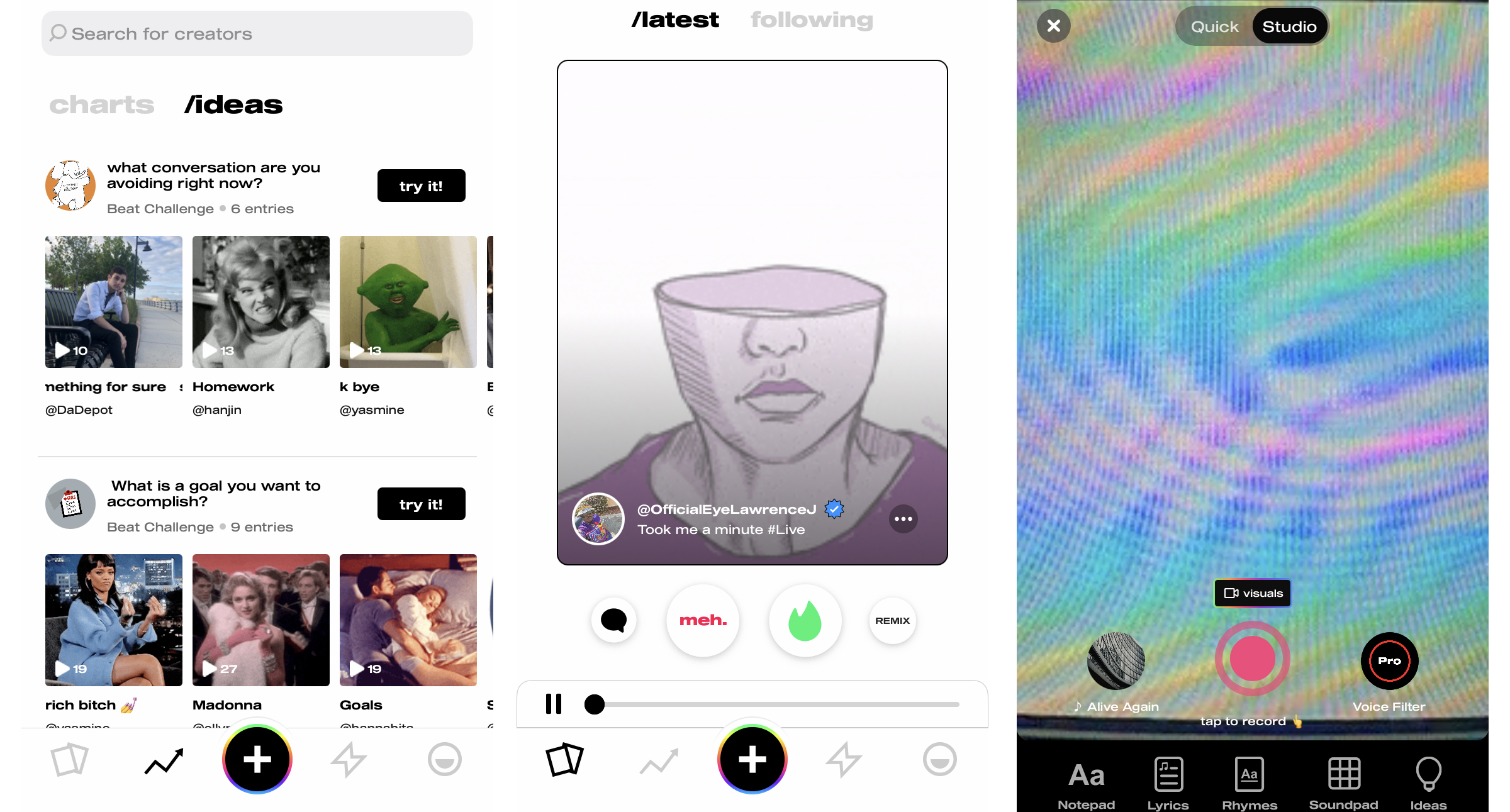Mayk.it also poses “ideas,” or prompts to spur creativity, like “What is your pet thinking about right now?” or “Make a song about your first crush.” There’s also a Tinder-like tab that lets you swipe left or right on songs — if you really like it, you can leave a comment (called an “encouragement” in an attempt to keep things supportive) or remix it.