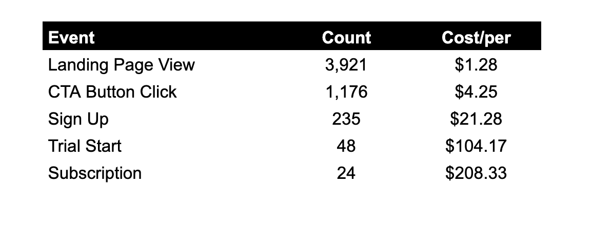 Let’s take an example of a health-and-wellness app with a goal of driving memberships to their coaching program. They’re just starting out with exploring paid acquisition and spending $5,000 per week on Facebook. Below is a look at their events in the funnel, weekly volume and cost per event: