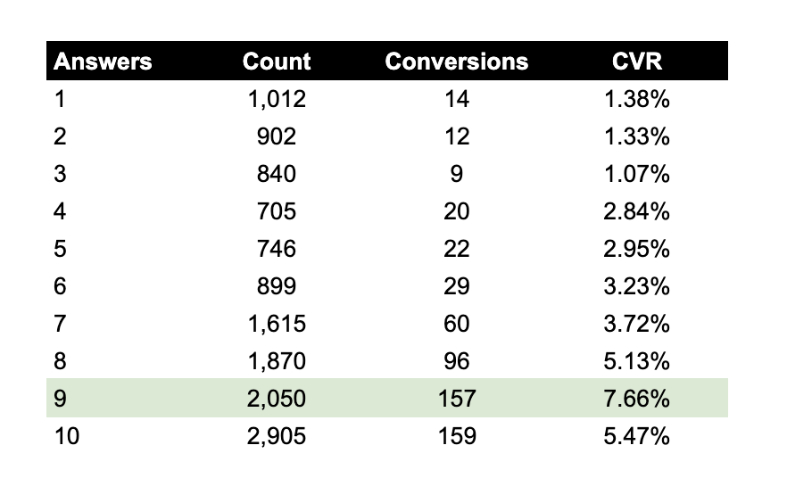 In the above example, we see that users who responded with “9” have a 7.66% likelihood to convert. Therefore, this should be the event we optimize for. Artificially adding steps that qualify users in a longer flow can help steer optimization targeting in the right direction.