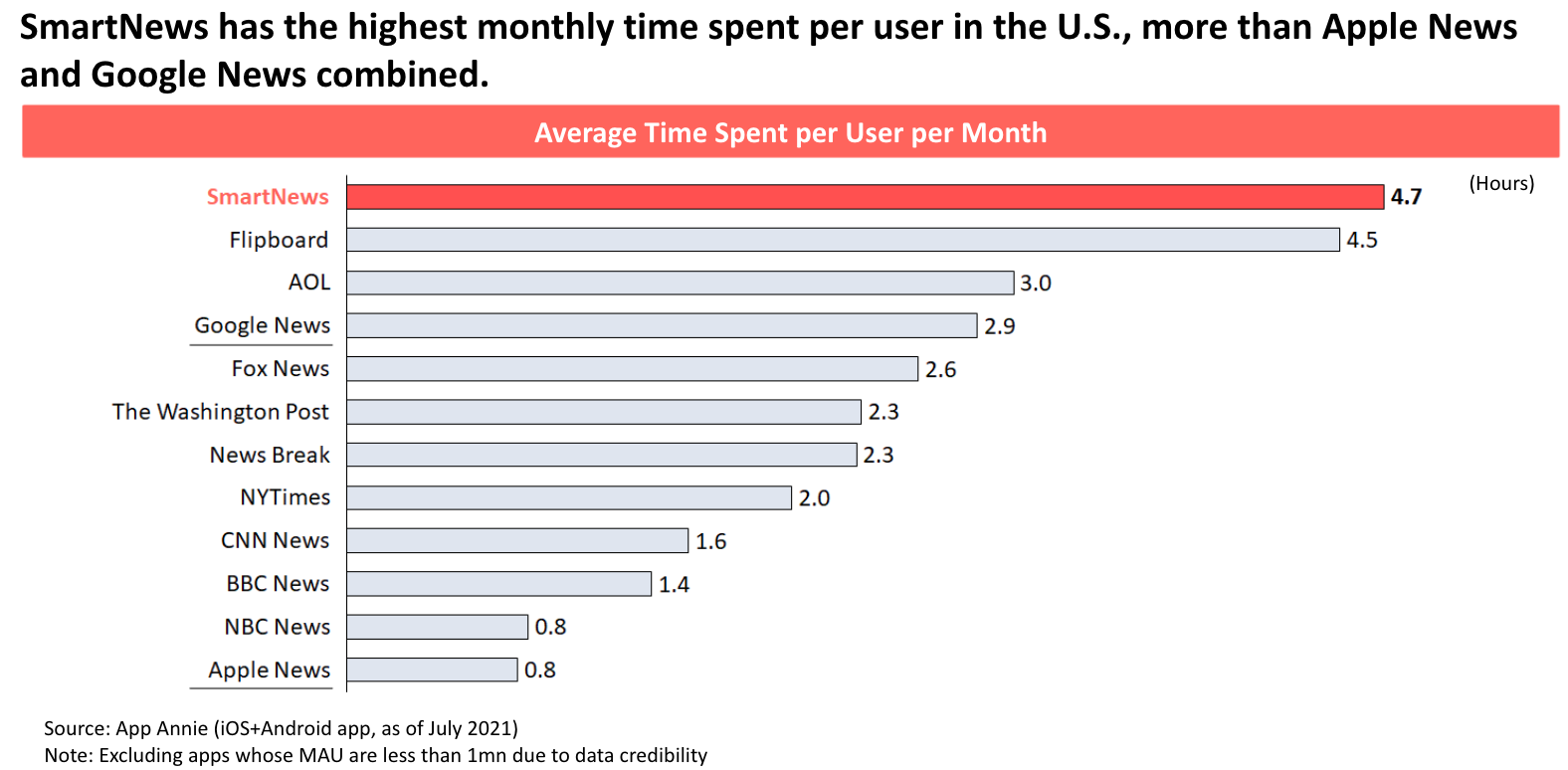 SmartNews’ app has proven to be very sticky, in terms of attracting and keeping users’ attention. The company tells us, citing App Annie July 2021 data, that it sees an average time spent per user per month on U.S. mobile devices that’s higher than Google News or Apple News combined.