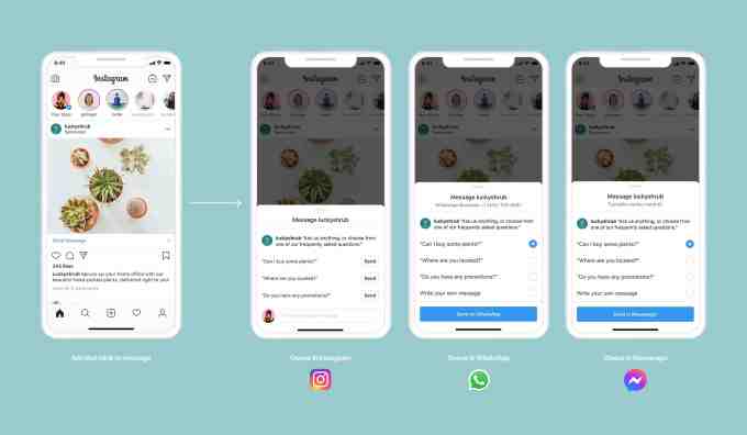 Facebook is also making it easier for businesses to chat with customers. They’re already able to buy ads that encourage people to message them on Facebook’s various chat platforms — Messenger, Instagram Direct or WhatsApp. Now, they’ll be able to choose all the messaging platforms where they’re available, and Facebook will default the chat app showcased in the ad based on where the conversation is most likely to happen.