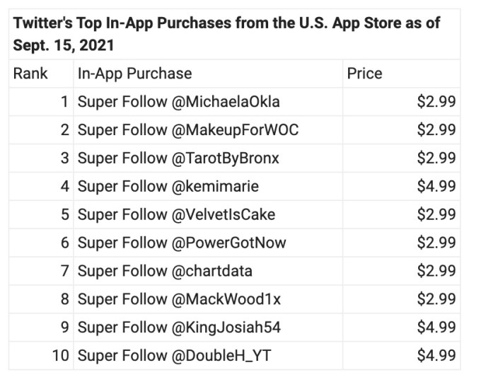 Update, 9/20/21: App intelligence firm Appfigures has now calculated its own numbers for Twitter’s IAP revenue. From Sept. 1 through Sept 17, it saw $12,400 in gross revenue in the U.S. — a bit of a longer period than Sensor Tower analyzed, which partially accounts for the higher figure. However, most of the revenue came during the first week, the firm notes.