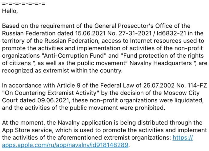 “We note that the Prosecutor’s Office of the Russian Federation and the Prosecutor’s Office of the City of Moscow have also determined that the app violates the legislation of the Russian Federation by enabling interference in elections,” Apple writes in the notification of takedown it sent to the developer of the tactical voting app.