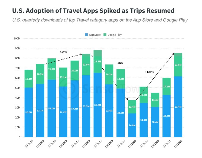 - Downloads of top Travel apps in the U.S. reached 61.4 million on Apple’s App Store and 23.8 million on Google Play in Q2 2021, according to a new report by Sensor Tower. This represented the highest number of quarterly downloads since the outbreak of COVID-19.