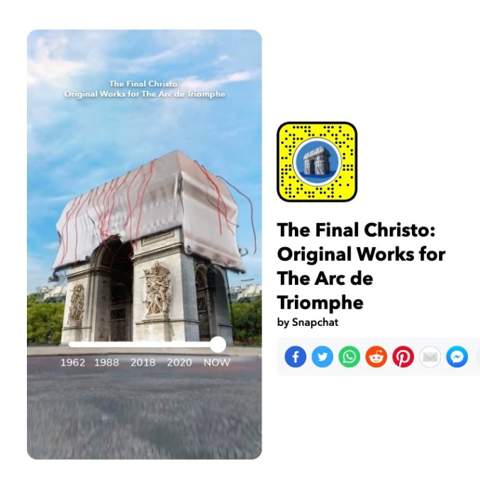 - Snapchat launched a new global portal Lens in partnership with Sotheby’s and the Estate of Christo. The Lens, “The Last Christo: Original Works for The Arc de Triomphe,” overlays Snap’s AR onto Christo’s work to give viewers an entirely new experience of the installation. The experience will also come to Snap’s main Camera and the Snap Map early next week.