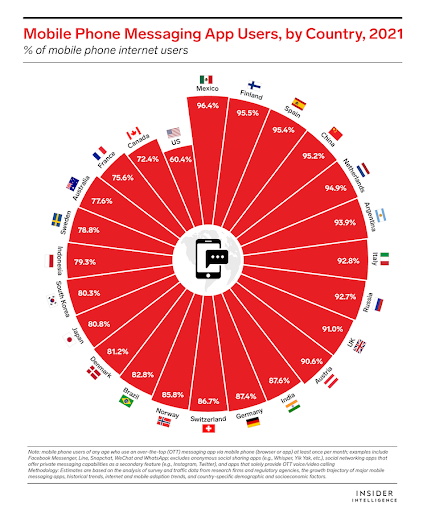 - Emarketer reports the number of monthly messaging app users worldwide will rise 6.1%, to 3.09 billion, in 2021. This is a deceleration of growth from 2020, when the number grew nearly 14%, but an increase from a pre-pandemic estimate of 5.5% growth. By 2024, the firm predicts more than three-fourths of internet users will use a mobile messaging app.