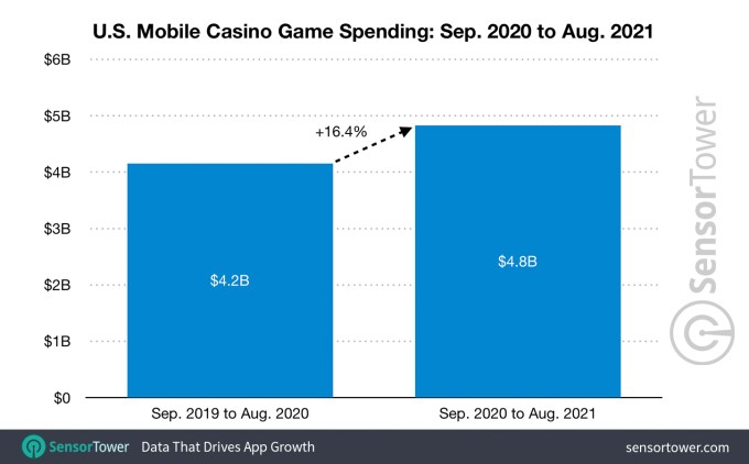 - U.S. mobile casino game spending grew by 16.4% to $4.8 billion during the last 12 months, according to a new Sensor Tower report. The No. 1 title from September 1, 2020 to August 31, 2021 was Coin Master from Moon Active, which generated $650.5 million. This was followed by Bingo Blitz from Playtika, then Slotomania from Playtika.