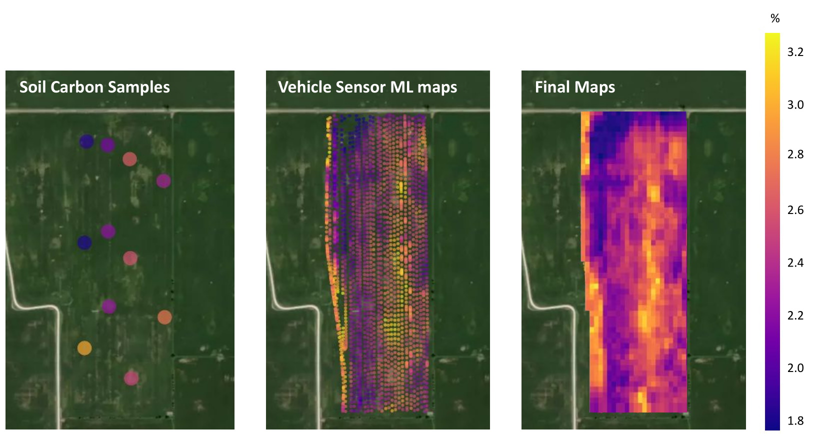Machine learning is at the heart of the company’s pair of tools, GroundOwl and C-Mapper (C as in carbon). The team trained a model that reconciles the no-contact data with traditional samples taken at a much lower rate, learning to predict soil characteristics accurately at a level of precision far beyond what has traditionally been possible. The imaging hardware can be mounted on ordinary tractors or trucks, and pulls in readings every few feet. Physical sampling still happens, but dozens rather than hundreds of times.