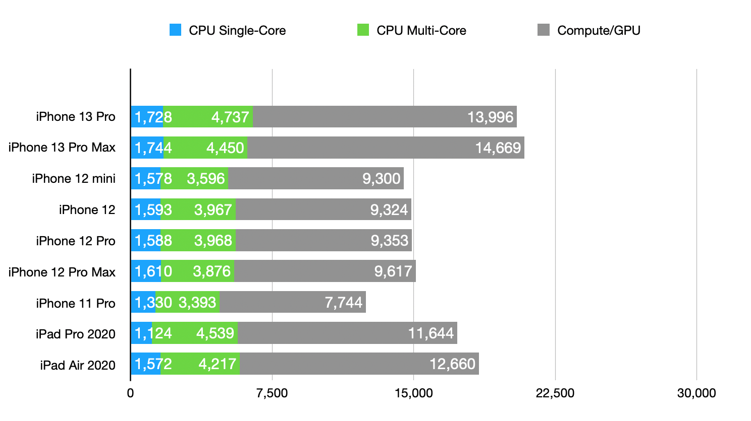 Impressive as hell, especially for more battery life not less. The power-per-watt performance of Apple’s devices continues to be the (relatively) unsung victory of its chips department. It’s not just that this year’s iPhones or the M1 laptops are crazy fast, it’s that they’re also actually usable for enormous amounts of time not connected to a charger. For those curious, the iPhone 13 Pro appears to have 6 GB of RAM.