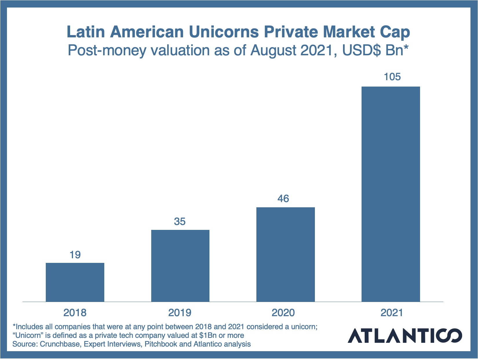 An initial top-down view paints a clear picture of a region at an inflection point. The Atlantico Digital Transformation Index, which measures tech penetration by tracking the value of public technology companies as a percentage of GDP, rose to 3.4% in 2021 from 2.3% in 2020 for LatAm as of August.