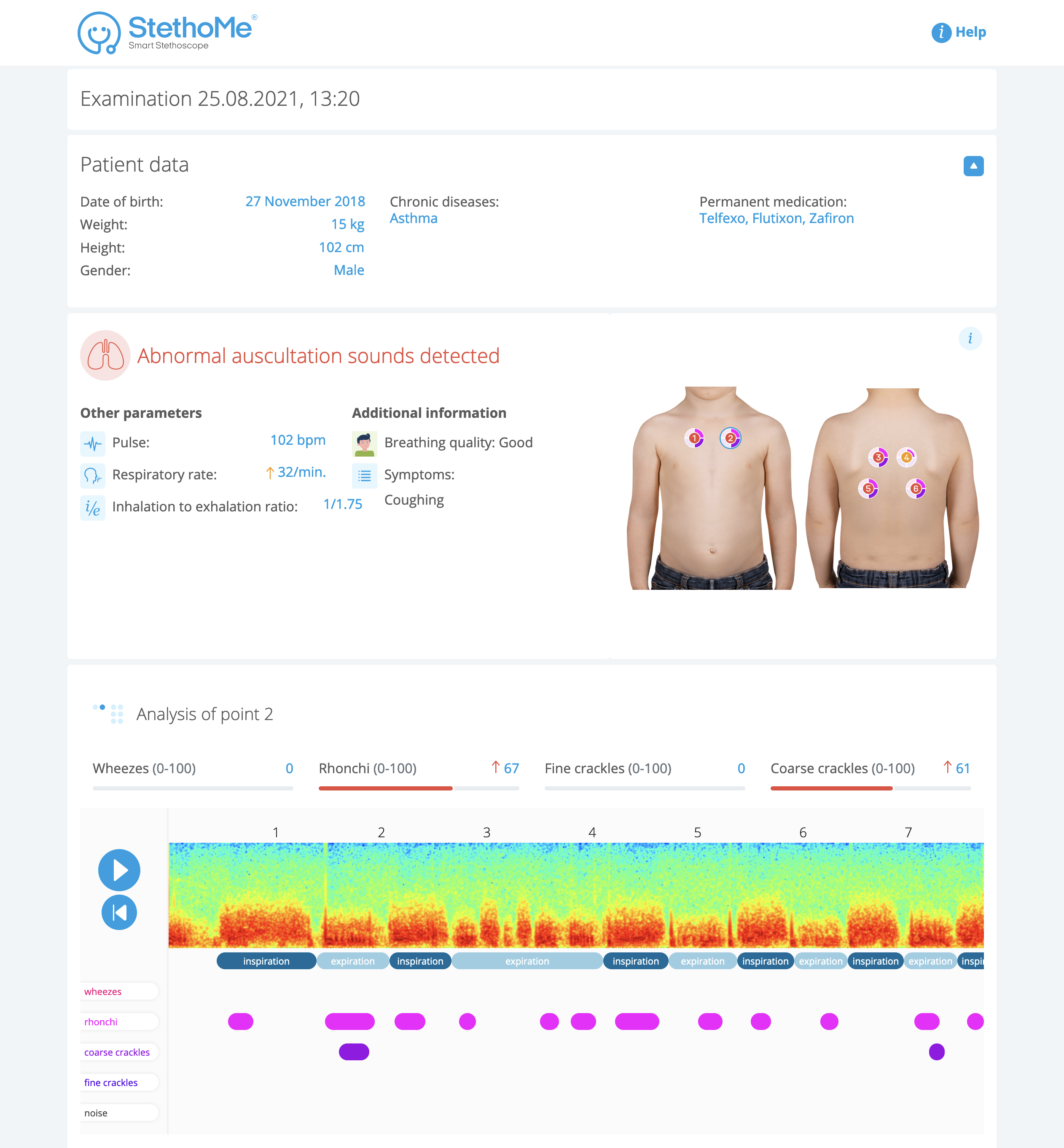 From there, you’re able to send a link to the report directly to your kid’s doctor, where they can hear the recorded audio from each point on the chest. A scrubbable spectrogram, meanwhile, provides a visual overview of each recording and flags and labels any abnormalities detected by the system. That report looks like this: