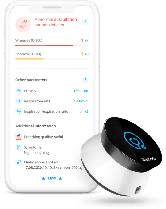 Turn it on, use your phone to tell it what kind of exam you want to perform, and the built-in screen will walk you through the process. It’ll tell you where on the chest to place the device, whether the room you’re in is quiet enough and more. After measuring across 6-8 points, it’ll provide you a report with details like respiratory rate, heart rate and whether it detected any audio abnormalities — including wheezing, rhonci (gurgling sounds caused by fluid) or crackles.