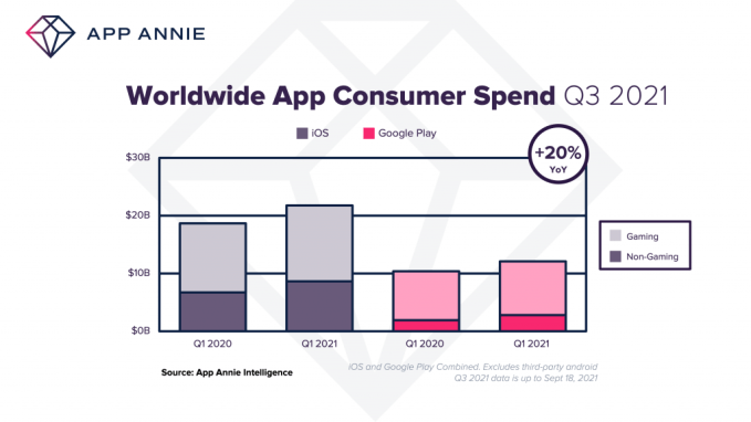 The firm said that the largest contributor to app revenue in Q3 continues to be in-game spending and mobile subscriptions — the latter, a focus of lawsuits and increased regulation as both Apple and Google fight to retain their right to a cut of the purchases flowing through their app store platforms. Gaming continues to account for the majority of consumer spend, though non-gaming spending has grown its share over the past few years, thanks to subscriptions.