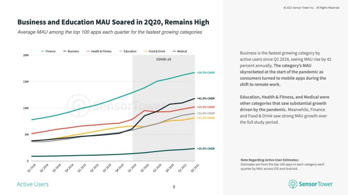 Business apps saw the highest compound annual growth rate (CAGR) between Q1 2018 and Q2 2021, climbing nearly 42% over that time frame, Sensor Tower said. Meanwhile, consumers in Q2 2021 spent the most time in entertainment apps, with each of the top 100 seeing nearly 29 minutes of daily usage, on average.