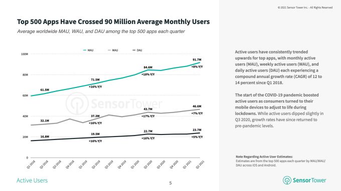 Sensor Tower also credits earlier increases in active users across apps to the COVID-19 pandemic as users who turned to mobile devices during lockdowns. But after a slight dip in Q3 2020, growth in active users has now returned to pre-pandemic levels, it said.
