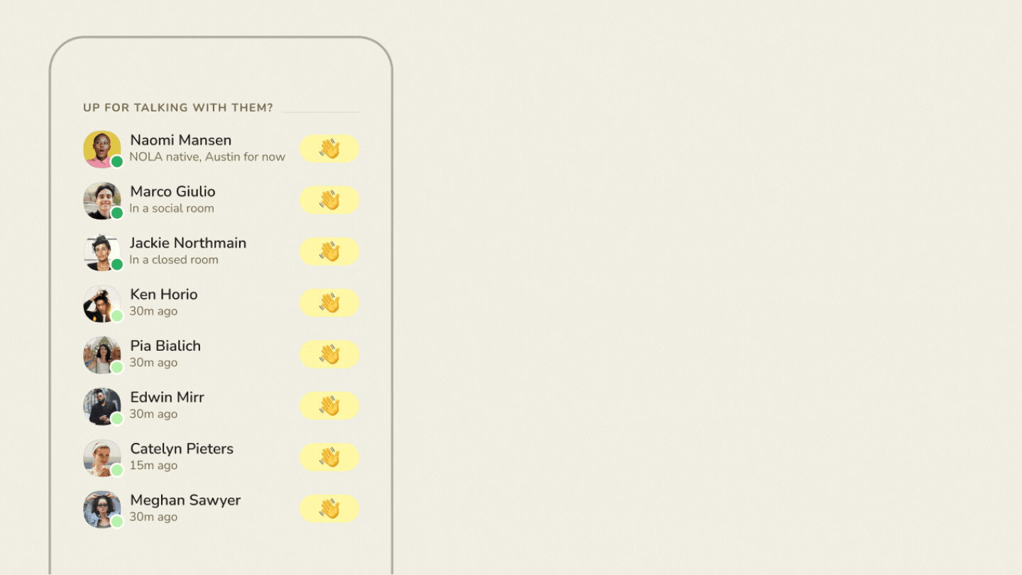 To send a wave, navigate to the Hallway by swiping right or tapping the dots icon on the bottom left of the screen. Then, tap the wave button next to the names of the people you want to chat with. Those people will get a notification that you invited them to a room — if they deny the request, you won’t know. If they accept, they can be added to a private room with you and anyone else who accepted your invitation.