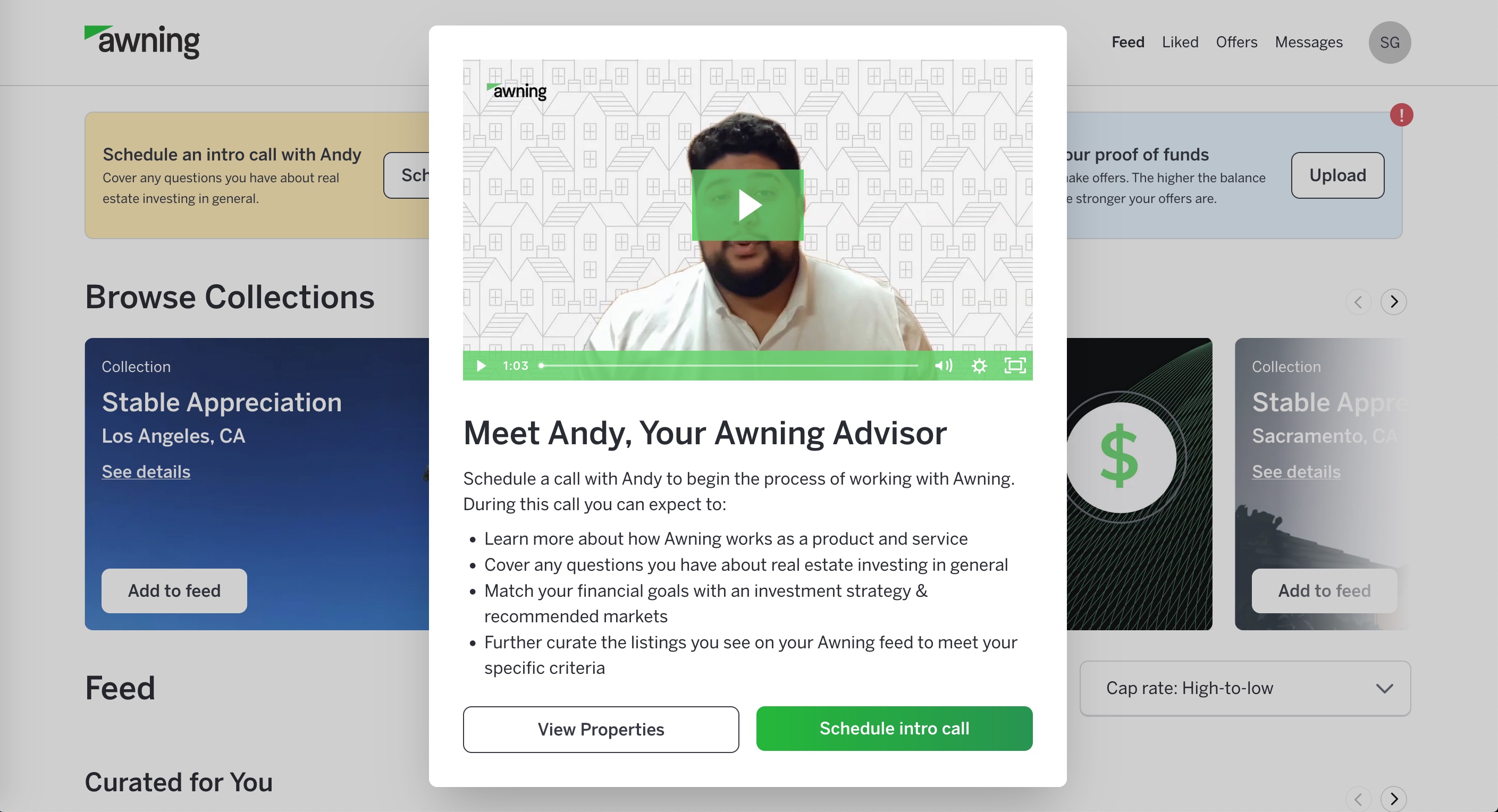 Awning’s “advisors” (also licensed real estate agents) curate properties that they believe are the best fit for an investor based on their budget and goals, and using the startup’s proprietary machine learning model, can estimate the rent, expenses, appreciation and potential ROI on every listing on the market.