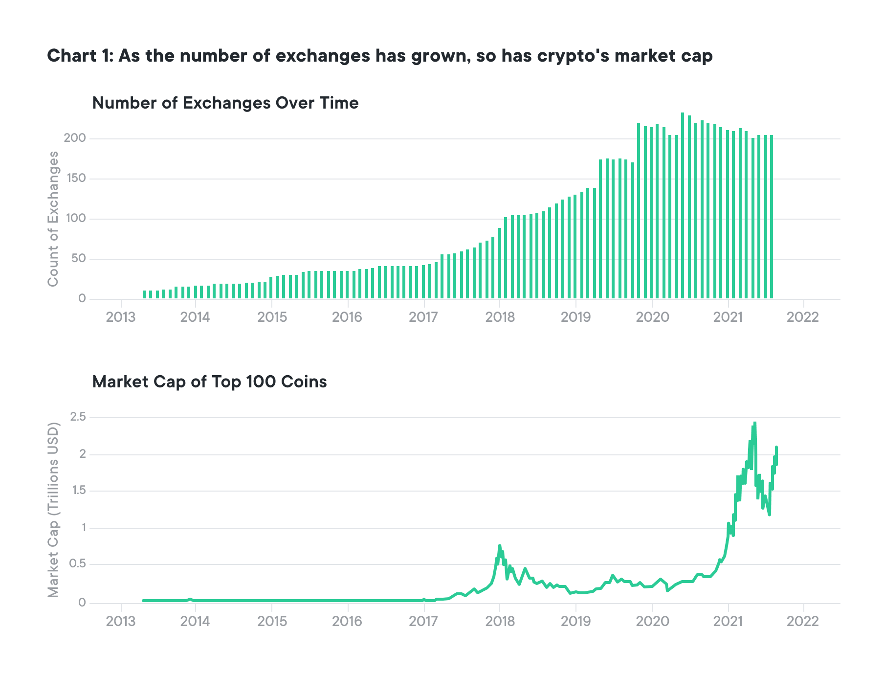For years (pre-2017), crypto liquidity was limited to a handful of exchanges with a few million dollars in volume across all assets. That’s dramatically changed in the past few years.