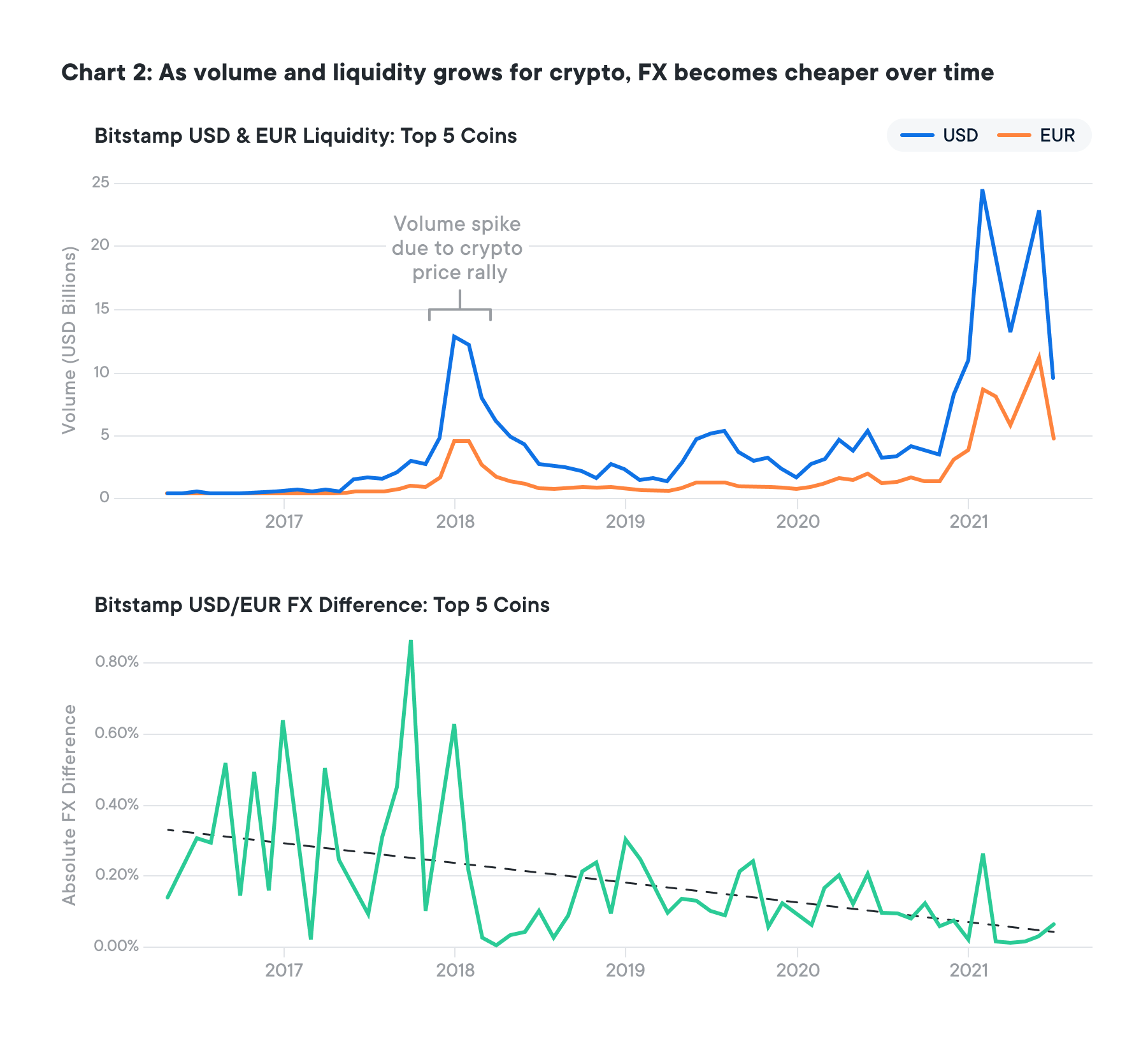 Using the chart below, we can see how crypto volume, an indicator of liquidity, has grown over the past five years by using five of the top cryptocurrencies by market cap (Bitcoin, Ether, XRP, Litecoin and Bitcoin Cash) on Bitstamp as a proxy for the larger crypto market. These assets combined consistently accounted for about 85% of all crypto volume (outside of stablecoins) from 2016 to 2021.