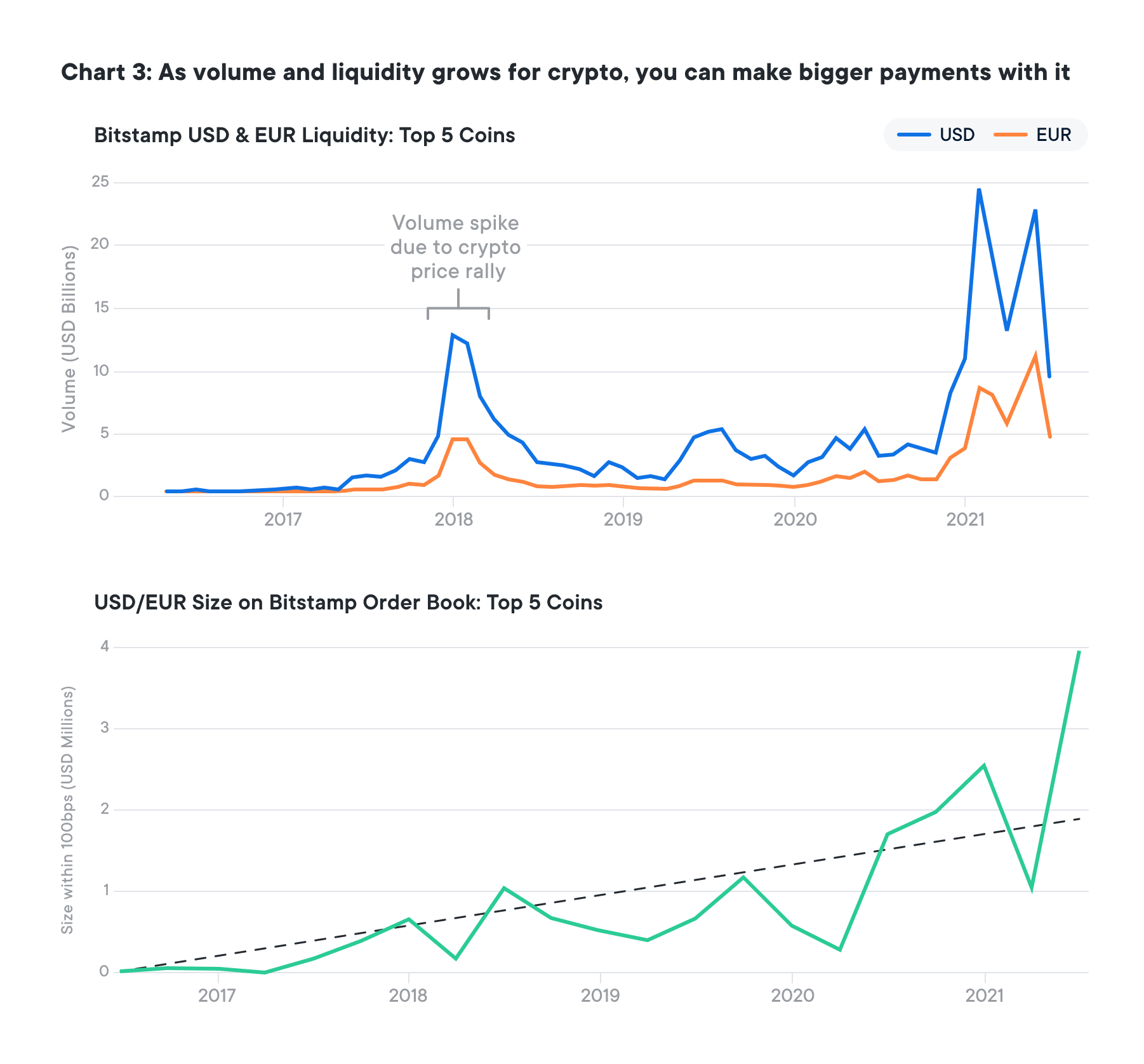 Ripple early on focused on the thesis that it will become cheaper to source liquidity for cross-border payments with crypto over traditional fiat if (1) crypto grows in volume around the world (measured by the level of liquidity on exchanges) and (2) you can make bigger payments with it (measured by order book size). What was a lofty vision in 2015 is now reality.