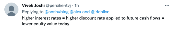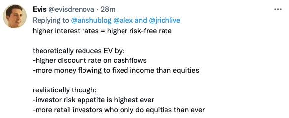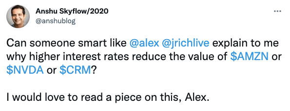 Investor and entrepreneur Anshu Sharma — formerly a partner at Storm Ventures, now CEO of privacy-focused SkyFlow — asked on Twitter today about the connection between interest rates and technology valuations: