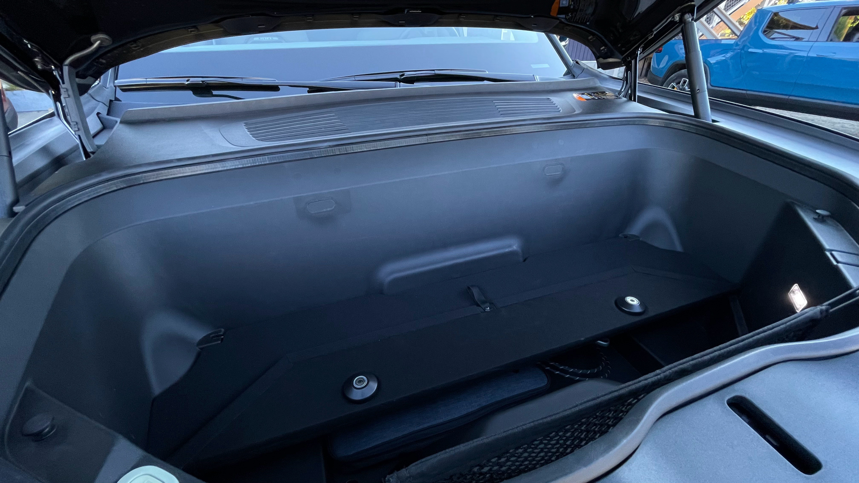 The result, in this case, is a truck with a low center of gravity and 68 cubic feet of cargo space, which the designers and engineers provide in thoughtful ways that consider customers of all heights. (The two-layered frunk, or front trunk, pictured below, being one such example.)
