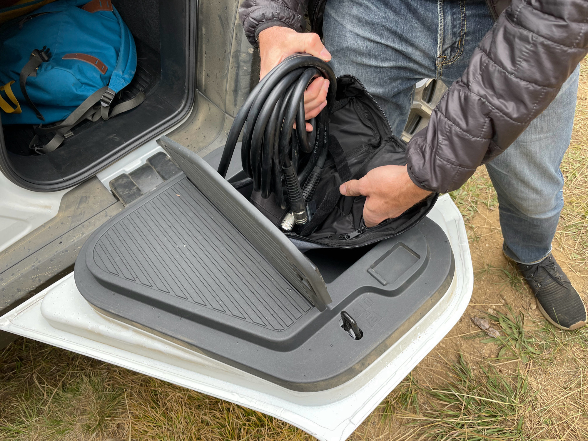 The gear tunnel doors, which pop up once the user pushes a button on the pickup bed frame, drop down. The doors, which are robust enough for a person to stand on, provide more storage. In the photo below, a Rivian employee can be seen removing the air compressor attachment from one of the compartments.
