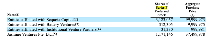 Here’s who bought into the Series F transaction across its various tranches (the table shows “the number of shares of our Series F redeemable convertible preferred stock purchased by [Amplitude] executive officers, directors, holders of more than 5% of [Amplitude’s] capital stock”):