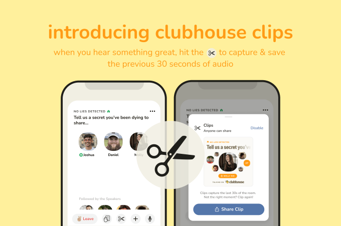 Clips will allow live listeners in public rooms to snip the most recent 30 seconds of audio and share it anywhere — so, if you’re listening to a speaker who says something particularly wise (or not), you can create a clip, which generates a shareable moment with a link to join the room. These can be shared on other social media platforms. Hosts can decide whether or not they want listeners to be able to make clips in their room — if clips are turned on, users will be able to tap a scissor icon to make one.