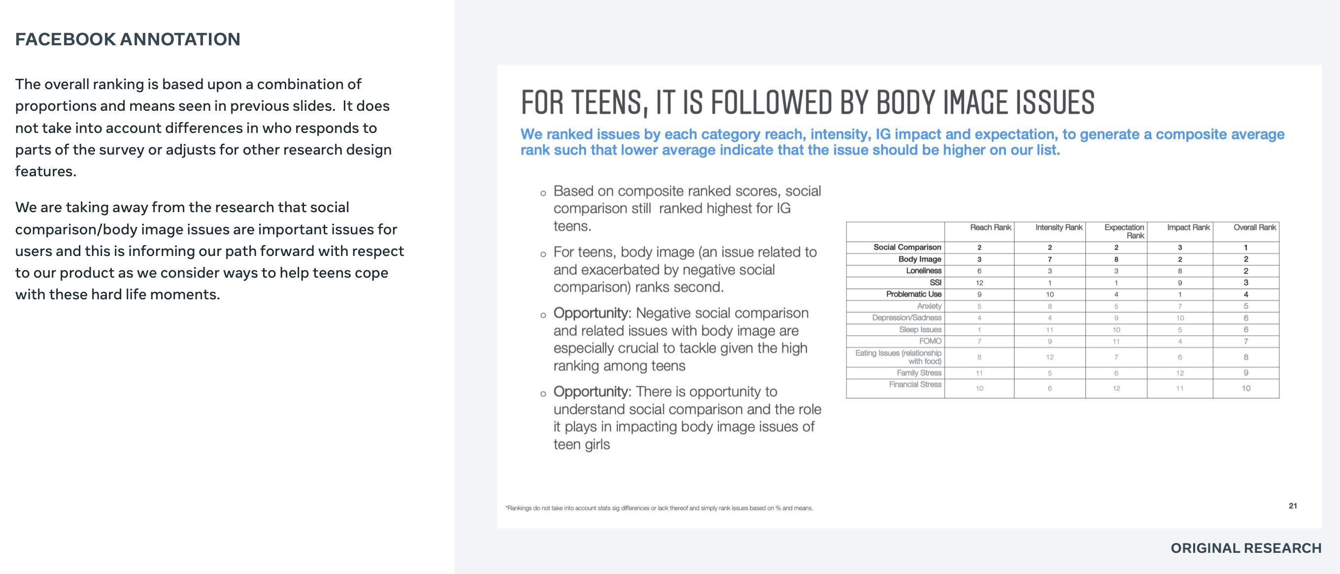 “The methodology is not fit to provide statistical estimates for the correlation between Instagram and mental health or to evaluate causal claims between social media and health/well-being,” Facebook writes in an introduction annotation on one of the slide decks. Aka “nothing to see here”.