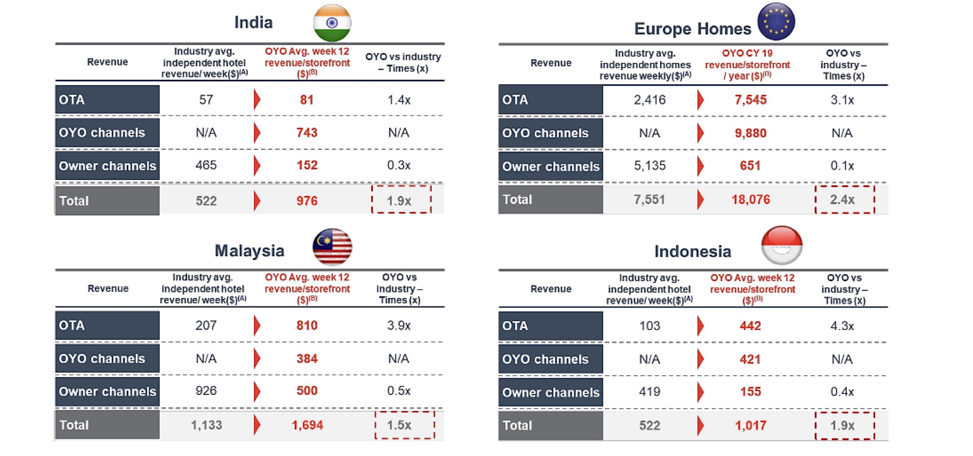 “In India, Indonesia and Malaysia, OYO-powered hotel storefronts that joined the platform in 2018 and 2019 performed better than independent hotels of similar sizes in India, Indonesia and Malaysia respectively in 2019 on average. After 12 weeks of joining the OYO platform, OYO-powered hotel storefronts generated 1.5 to 1.9 times more revenue on average compared with the average revenue estimated at independent hotels of a similar size in India, Indonesia and Malaysia in 2019. In Europe, OYO-powered home storefronts earned an average of 2.4 times more revenue in 2019 compared with the average revenue estimated at an independently managed home in Europe in 2019,” it said in the filing.