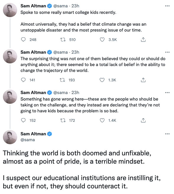 Altman’s thread makes me crumple up my face a little in annoyance. Not that he is wrong that optimism is something to be encouraged; rather, I am irked about where we find his locus of concern — that he’s worried about students over the folks who actually have the power to make changes to today’s economy and pollution landscape during these critical years.
