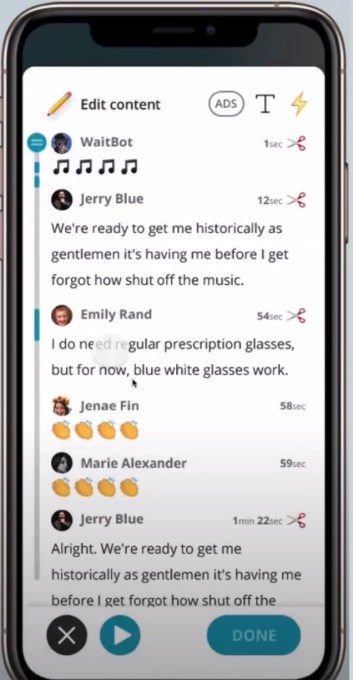 When the recording has wrapped, creators gain access to a transcript and the ability to edit the content before further distribution. In the editing interface, creators can cut out audio or video segments with a tap. This part is aided by how Fireside presents the data it recorded related to user sentiment and engagement. For example, if a portion of the show included negative sentiment or low engagement, a creator may choose to pull that piece out before distributing the show to other platforms. They can also edit the transcript text accordingly.