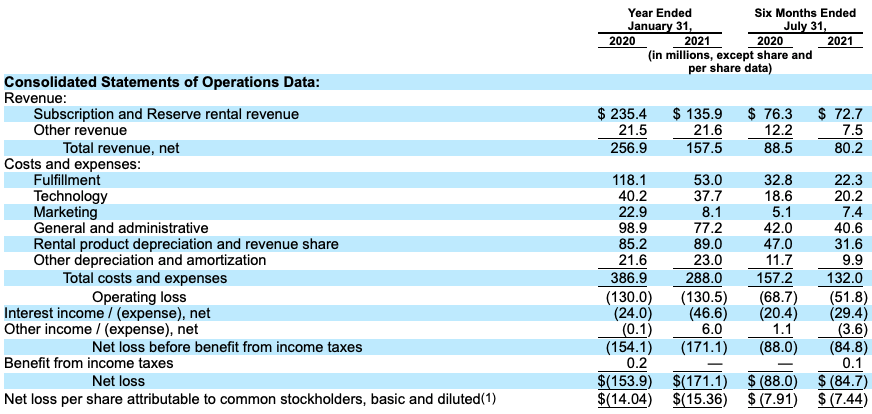 Closing our coverage of the company’s operating results on a high note, Rent the Runway’s July 31, 2021, quarter was its best in revenue terms since its April 30, 2020, period. And the company’s $15.0 million worth of “rental product depreciation and revenue share” was its lowest on record for any single-quarter period we have data for. Sadly, the company still lost $42.4 million on a net basis during the three-month period.