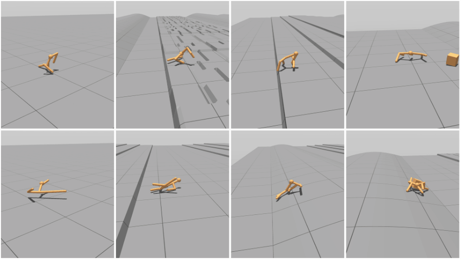 To find out, the team created a similar simulation to the old ones, dropping their sims, which they called “unimals” (for “universal animals” … we’ll see if this terminology takes off), into it at first just to learn to walk. The simple shapes had a spherical “head” and a few branchlike jointed limbs, with which they developed a number of interesting walks. Some stumbled forward, some developed a lizard-like articulated walk and others a flailing but effective style reminiscent of an octopus on land.