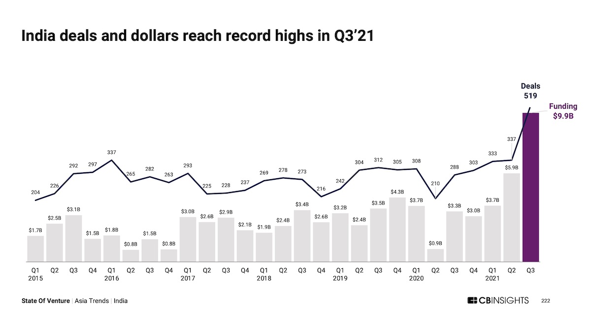 India’s startup ecosystem witnessed a record 519 deals in the quarter that ended in September this year, research firm CB Insights said in a report on Thursday. During the same quarter, the startups raised $9.9 billion, compared to $10.3 billion in all of last year, the report said. Sequoia Capital India was the most prolific investor in the world’s second largest internet market during the quarter with 33 deals.