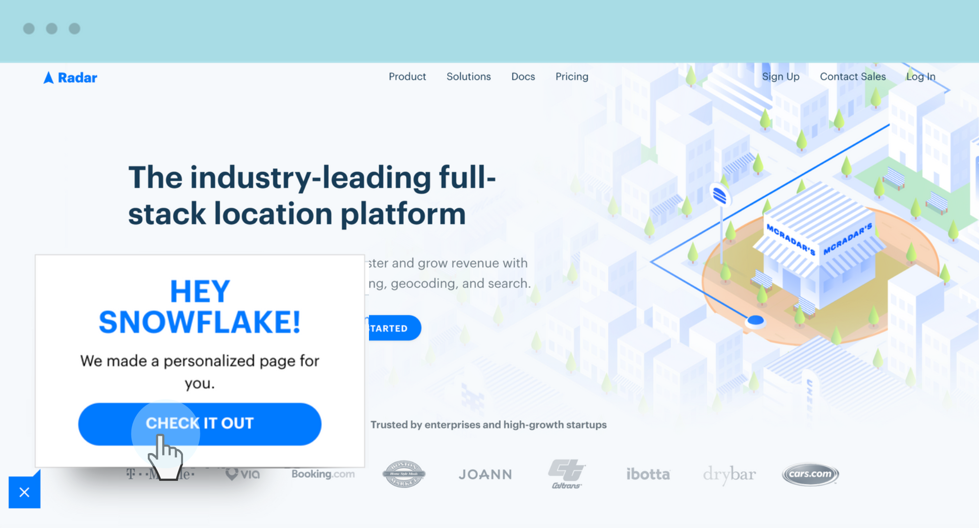 You can also capture relevant inbound visitors by using IP data as a source to create a side pop that drives to the landing page you’ve already built. This connects your inbound and outbound efforts. Once the landing page has been visited, you can follow up with a simple email with a link to book time with your rep — “Hey there! Looks like you checked out the page we made for you. Any questions I can answer? Feel free to book time here.”
